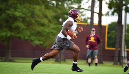 Above-Sophomore receiver Tyler Polk (left) runs a route and sophomore running back Jesse Pernell runs a drill during Pearl River Community College's first practice Monday. KRISTI HARRIS/PRCC ATHLETICS)
